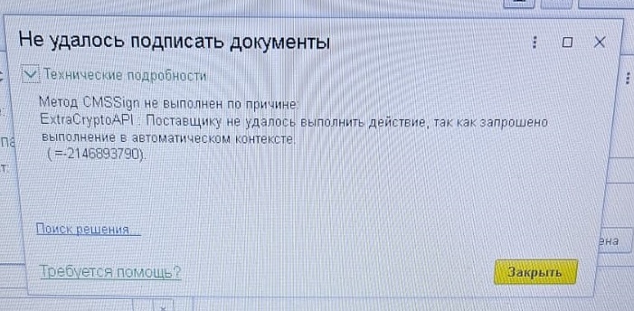 Читать дальше ->Метод CMSSign не выполнен по причине: ExtraCryptoAPI: Поставщику не удалось выполнить действие, так как запрошено выполнение в автоматическом контексте: (=.2146893790)